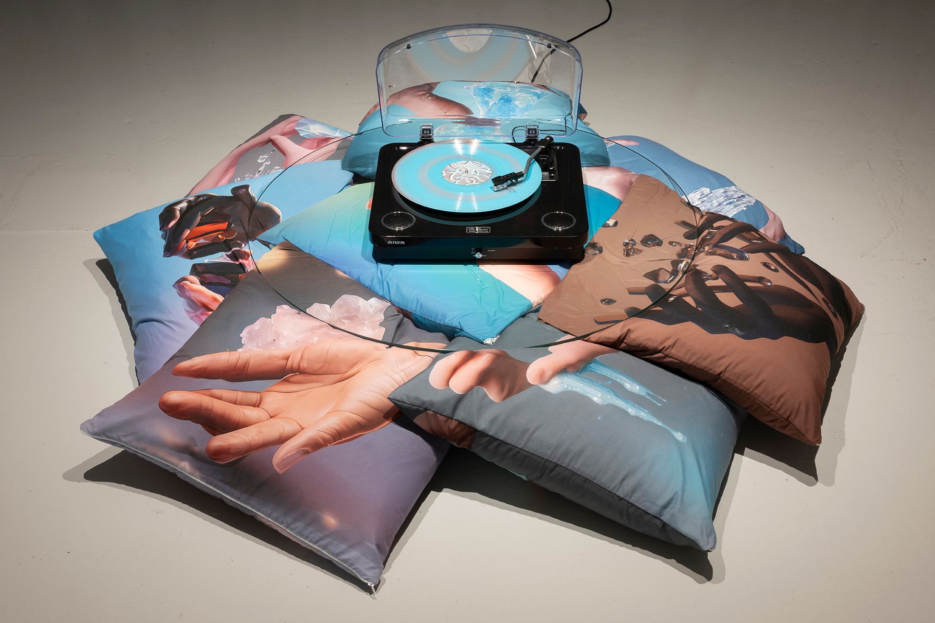 Instalación, mesa redonda de cristal con cojines estampados Medidas variables Ed. 1/2 + PA